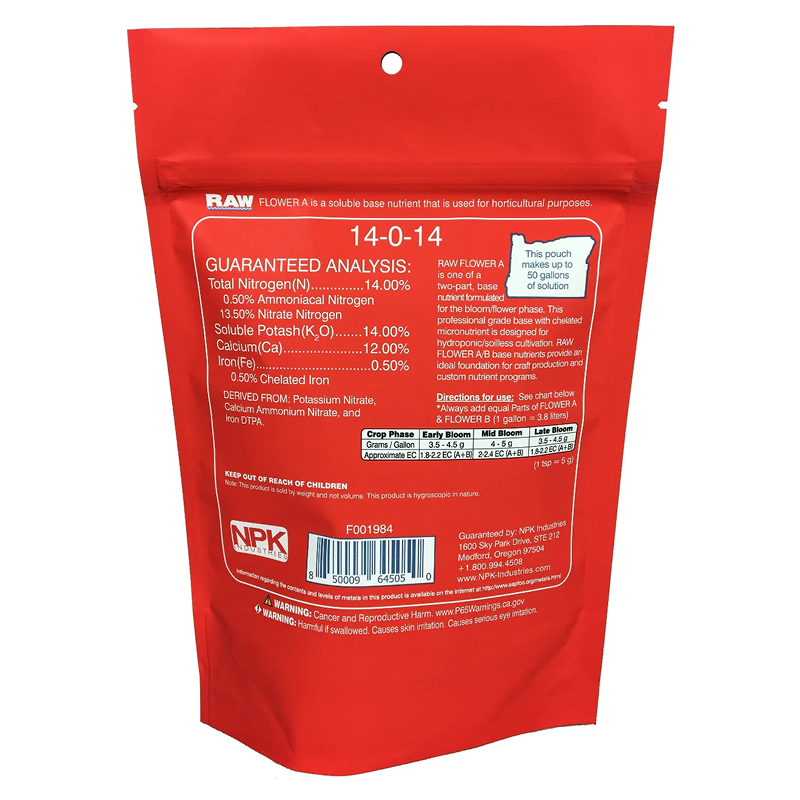 RAW FLOWER A is one of a two-part, commercial base nutrient formulated for the bloom/flowering phase. This professional grade base with chelated micronutrient is designed for hydroponic/soilless cultivation. RAW FLOWER A/B base nutrients provide an ideal foundation for commercial production and custom nutrient programs.