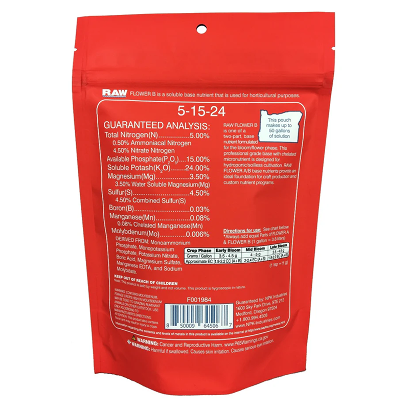 RAW FLOWER B is one of a two-part, commercial base nutrient formulated for the bloom/flowering phase. This professional grade base with chelated micronutrient is designed for hydroponic/soilless cultivation. RAW FLOWER A/B base nutrients provide an ideal foundation for commercial production and custom nutrient programs.