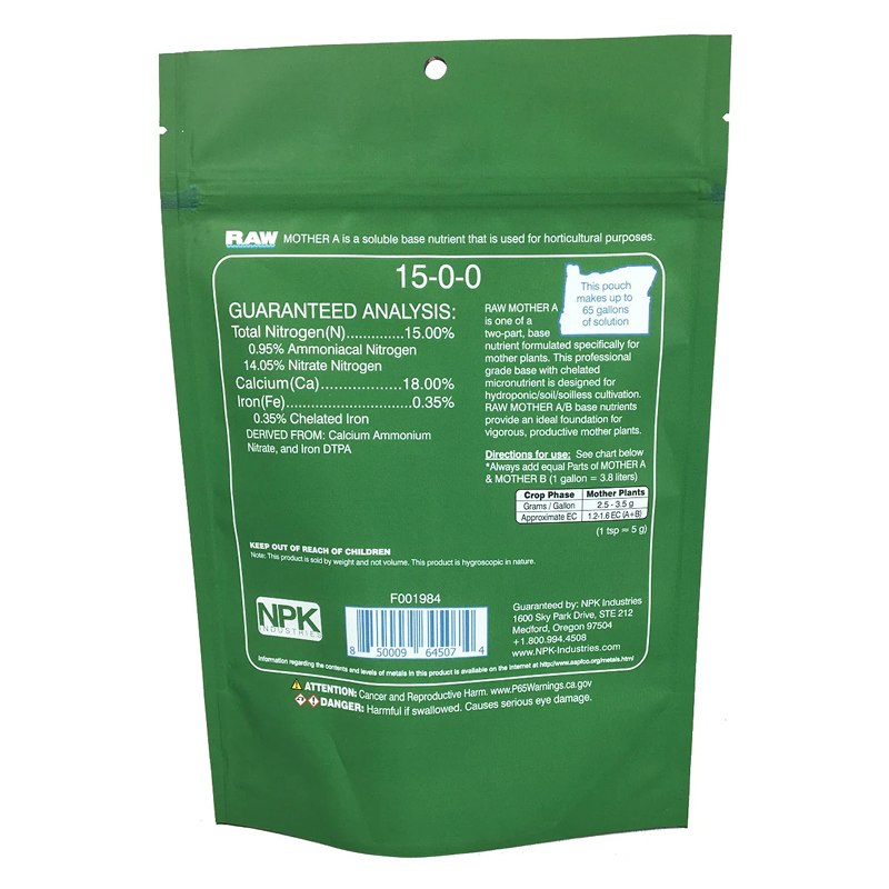 RAW MOTHER A is one of a two-part, commercial base nutrient formulated specifically for mother plants. This professional grade base with chelated micronutrient is designed for hydroponic/soil/soilless cultivation. RAW MOTHER A/B base nutrients provide an ideal foundation for vigorous, productive mother plants.