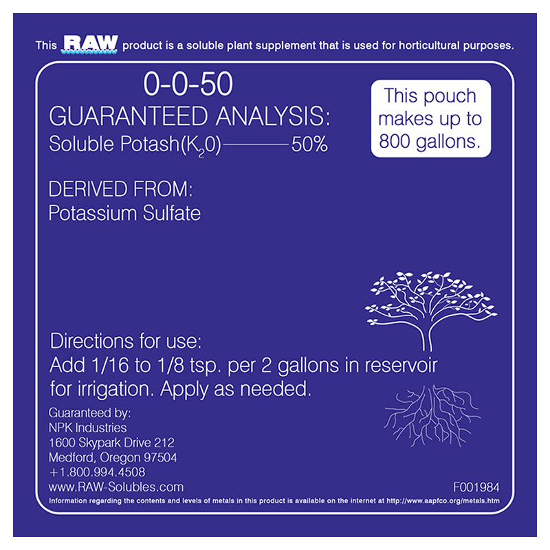RAW Potassium contains 50% Water Soluble Potash derived from potassium sulphate. During fruiting and flowering, large amounts of potassium are used by the plant in a matter of days which can lead to potassium deficiencies. RAW Potassium is ideal for boosting Potassium (K) levels, treating deficiencies and creating optimal recipe solutions. Works in conjunction with all nutrient and feeding programs.
