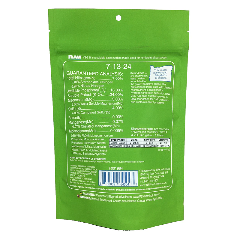 RAW VEG B is one of a two-part, commercial base nutrient formulated for the grow/vegetative phase. This professional grade base with chelated micronutrient is designed for hydroponic/soilless cultivation. RAW VEG A/B base nutrients provide an ideal foundation for commercial production and custom nutrient programs.